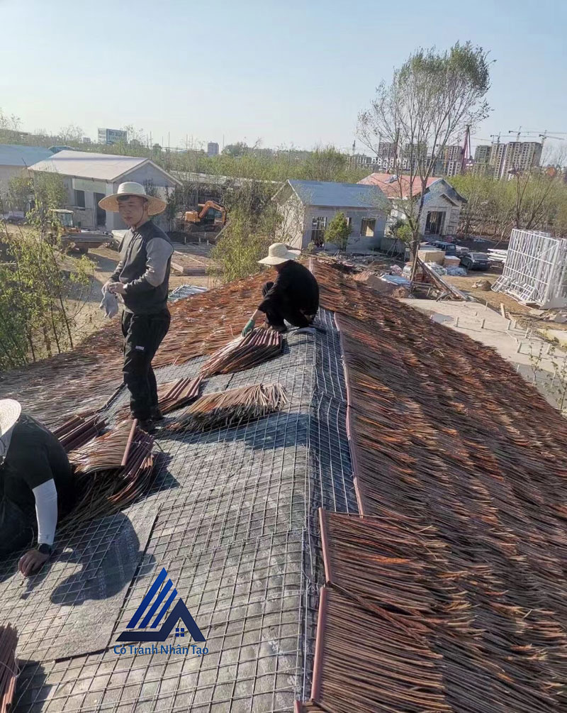 Đây là cách làm có ưu thế về thẩm mỹ vì khi nhìn lên trần ta sẽ thấy được toàn bộ hệ thống mái tranh. Chi phí nhiều hơn các cách khác thường là sự lựa chọn của các hệ thống resort, villas,… Sau khi lắp đặt xong hệ thống li tô sẽ lắp bắn 1 tấm rơm nhân tạo rồi đến 1 lớp giấy dầu.